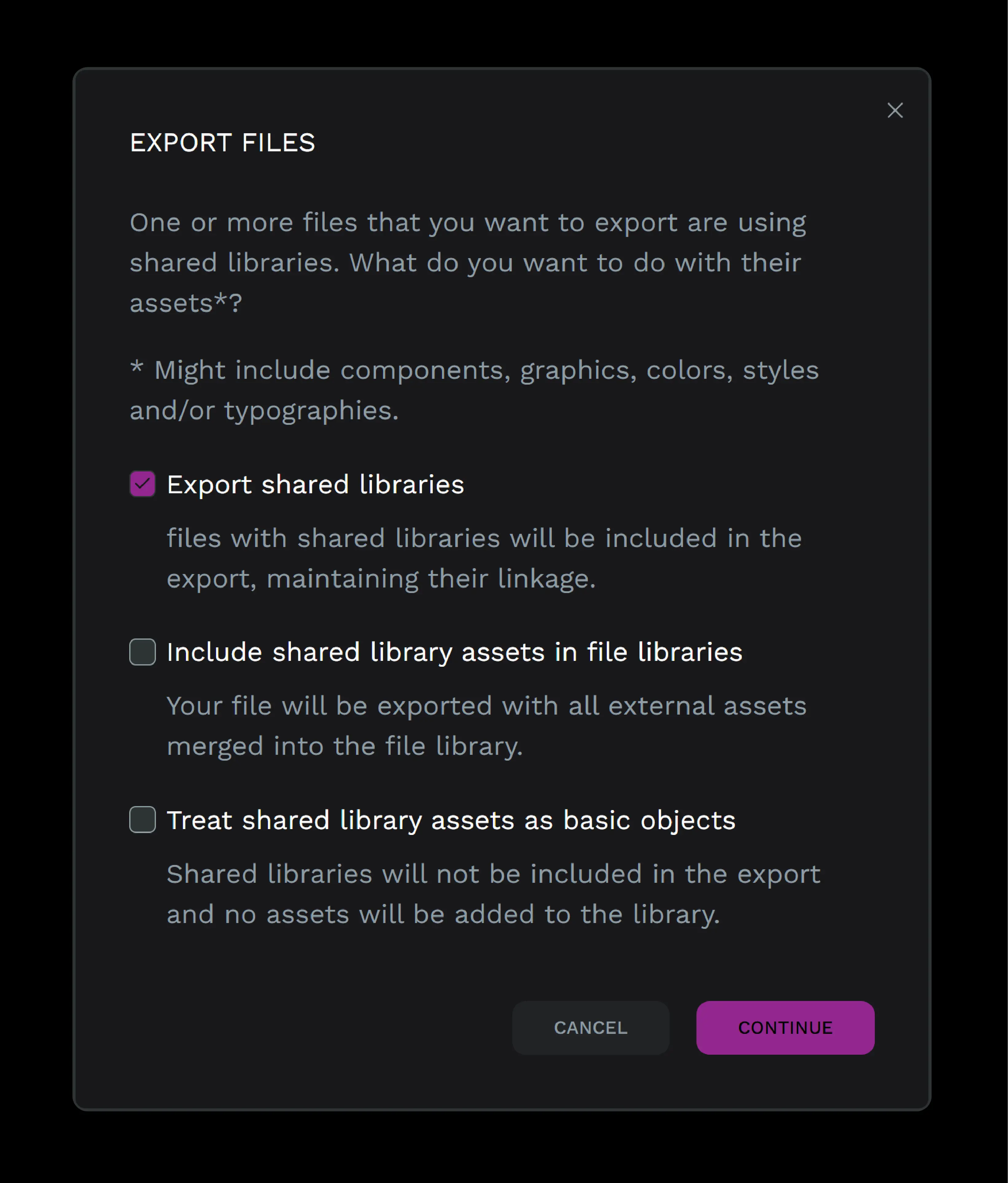 - Treat shared library assets as basic objects: Shared libraries will not be included in the export and no assets will be added to the library.