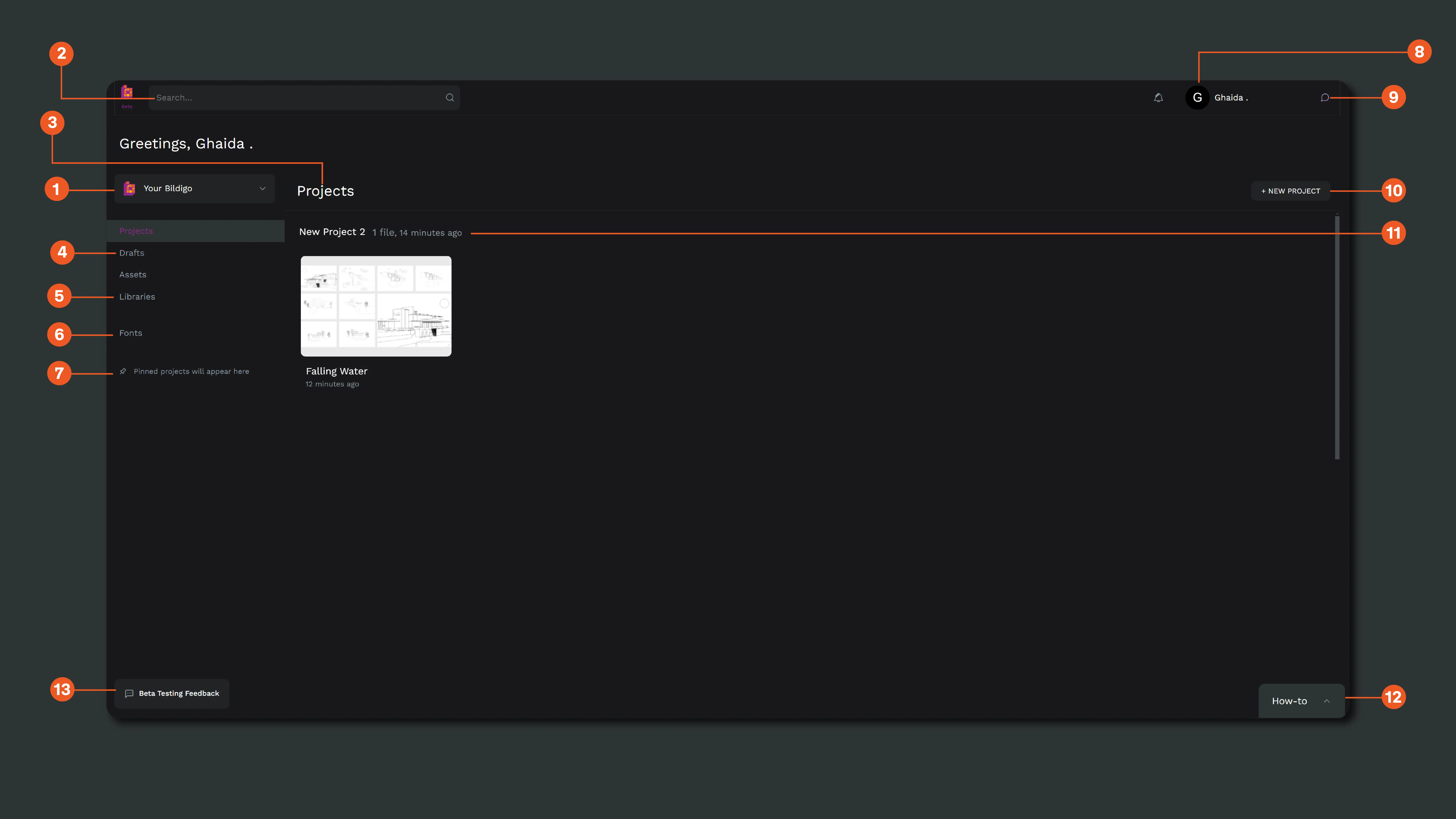 The bildigo interface has three main areas: Dashboard, Workspace and View mode. Lets take a look at their composition and main features.