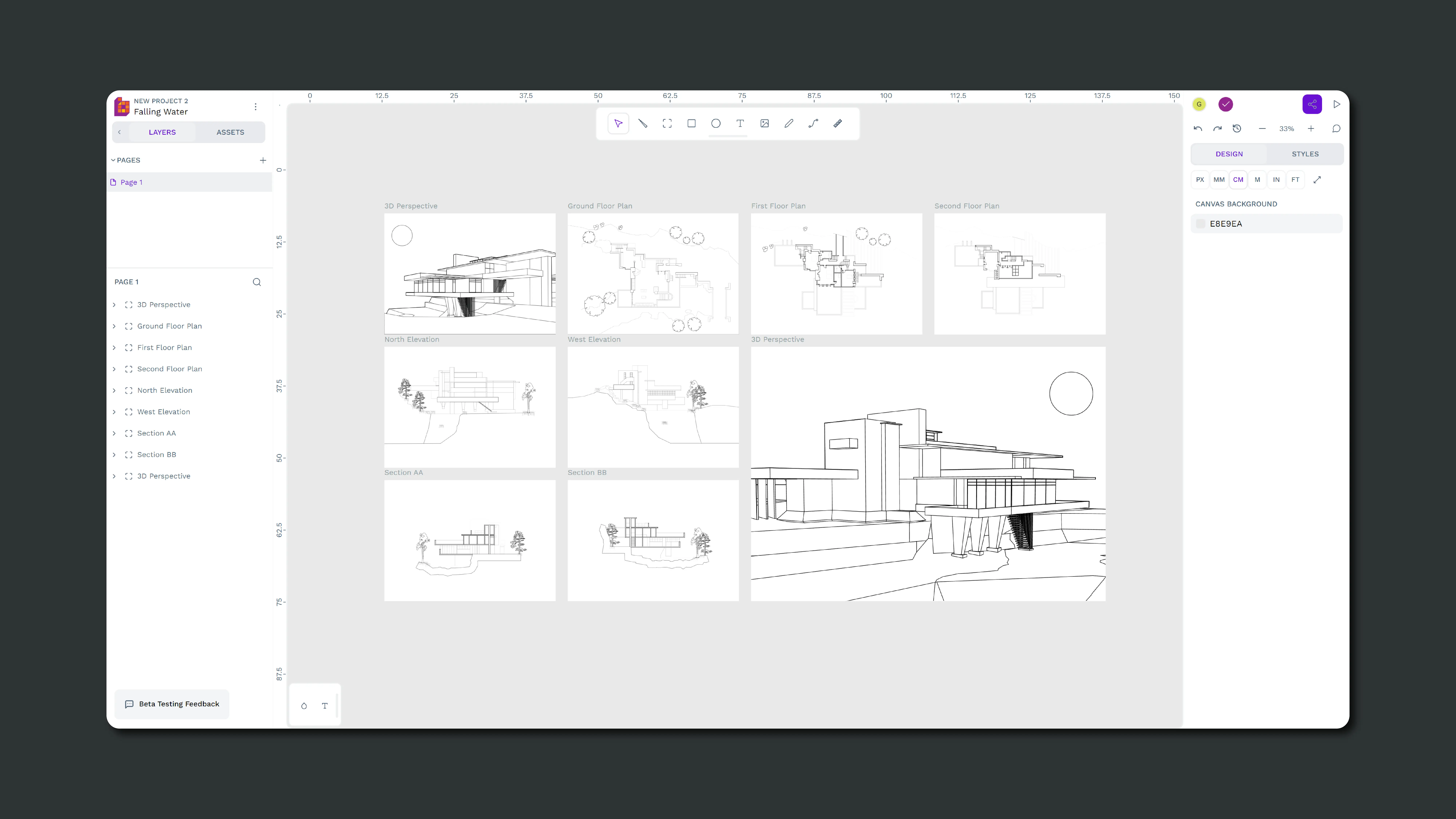 The Workspace is where you actually create your designs. You have an infinite canvas where you can work directly but you also have the ability to create and work inside boards that will help you to create pages and exportation units.