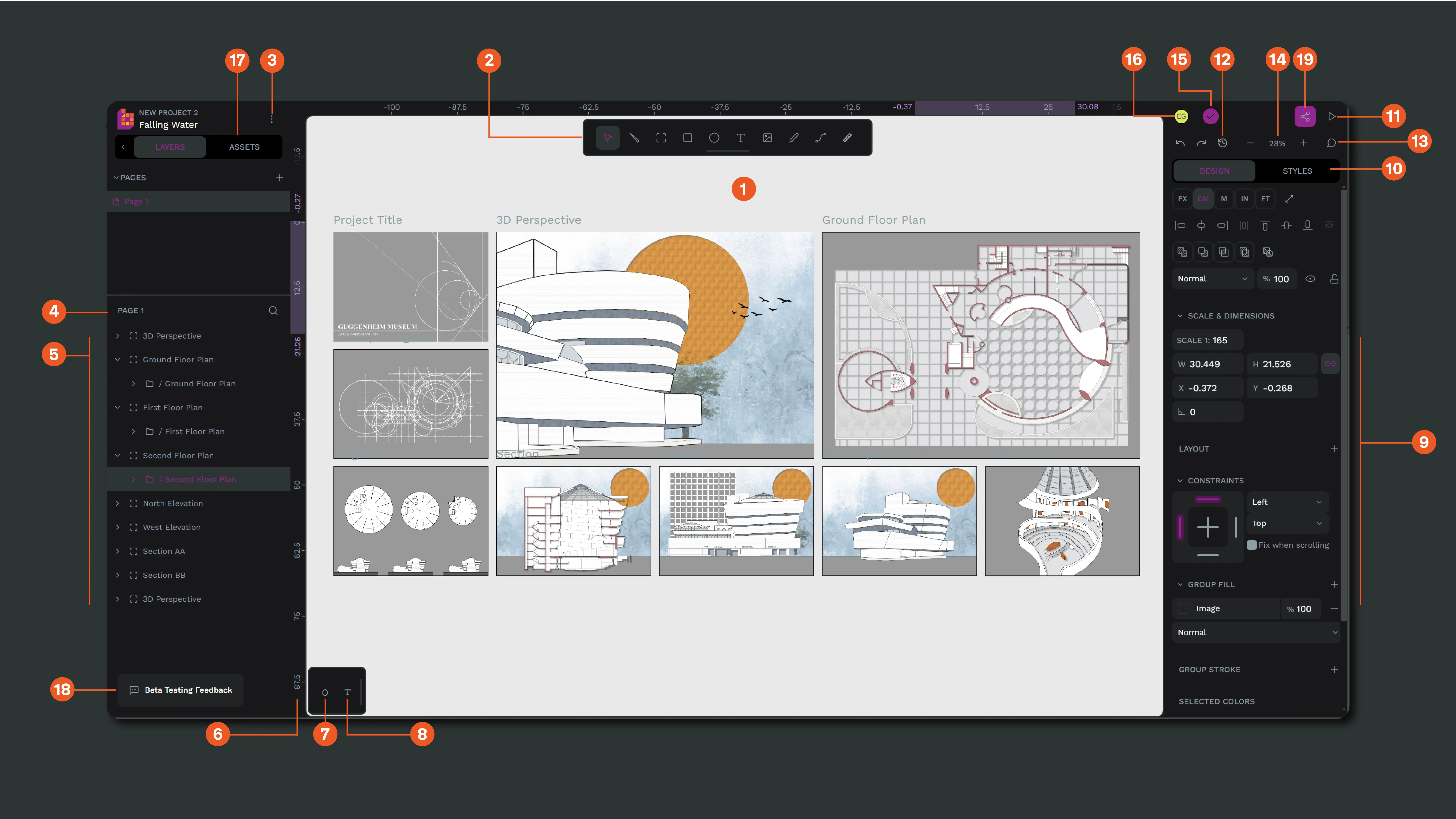 1) Viewport 2) Toolbar 3) Main menu 4) Pages 5) Layers 6) Rulers 7) Color palette 8) Typography palette 9) Design properties 10) Styles 11) View mode 12) History panel 13) Comments 14) Zoom 15) File status 16) Users 17) Assets panel 18) Beta 19) Share